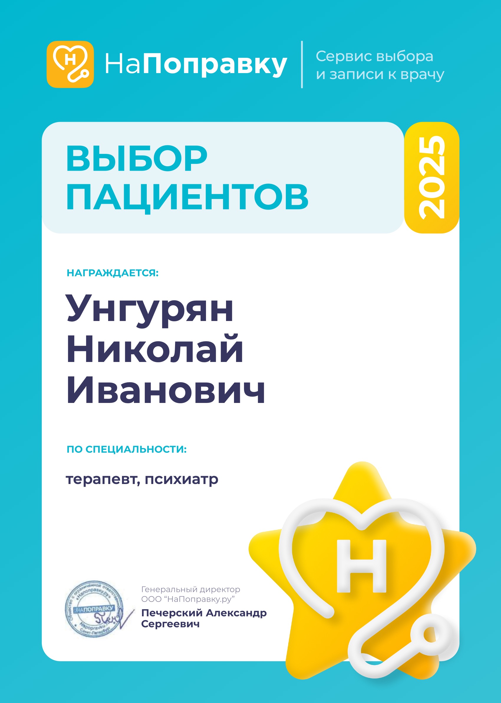 Обратились к Николаю Ивановичу полгода назад. Он очень тщательно и с пониманием отнёсся к нам. После разговора мы осознали нашу проблему и решили наблюдаться у доктора. Объяснил все нюансы нашего диагноза и начал лечение. Дочь стала меняться буквально с первого приема. Перестала употреблять, и уже пол года не замечена. Стала исправлять учебу в школе и поменяла круг друзей. После каждого приема приходит с новыми, правильными мыслями и реализует их. Лечение назначено грамотно. Были страхи побочных явлений от препаратов, но их не оказалось, за это особое спасибо, что учли наше пожелание и страхи. Спасибо Николаю Ивановичу!